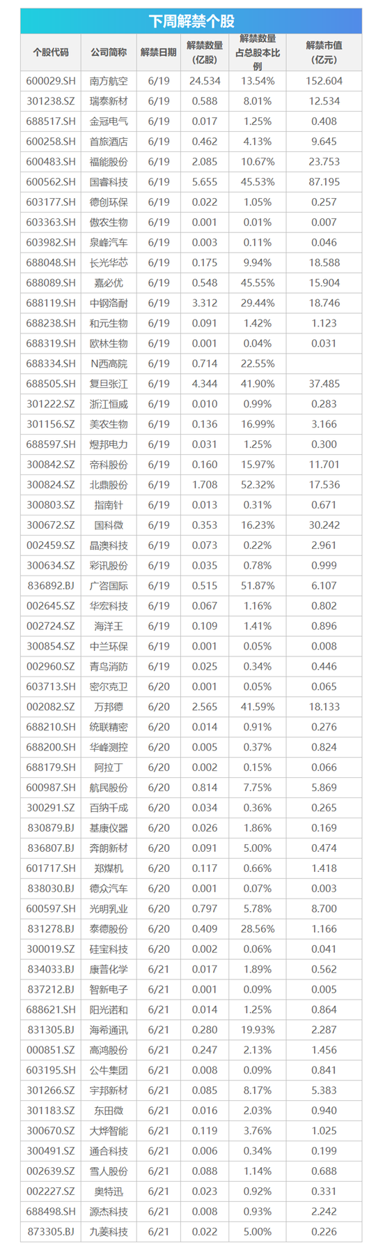下周,因端午假期,A股市集交游日仅有3天。Wind数据统计显露,下周共有逾50家公司限售股不绝解禁,按6月16日收盘价规画,解禁总市值为508.96亿元。
